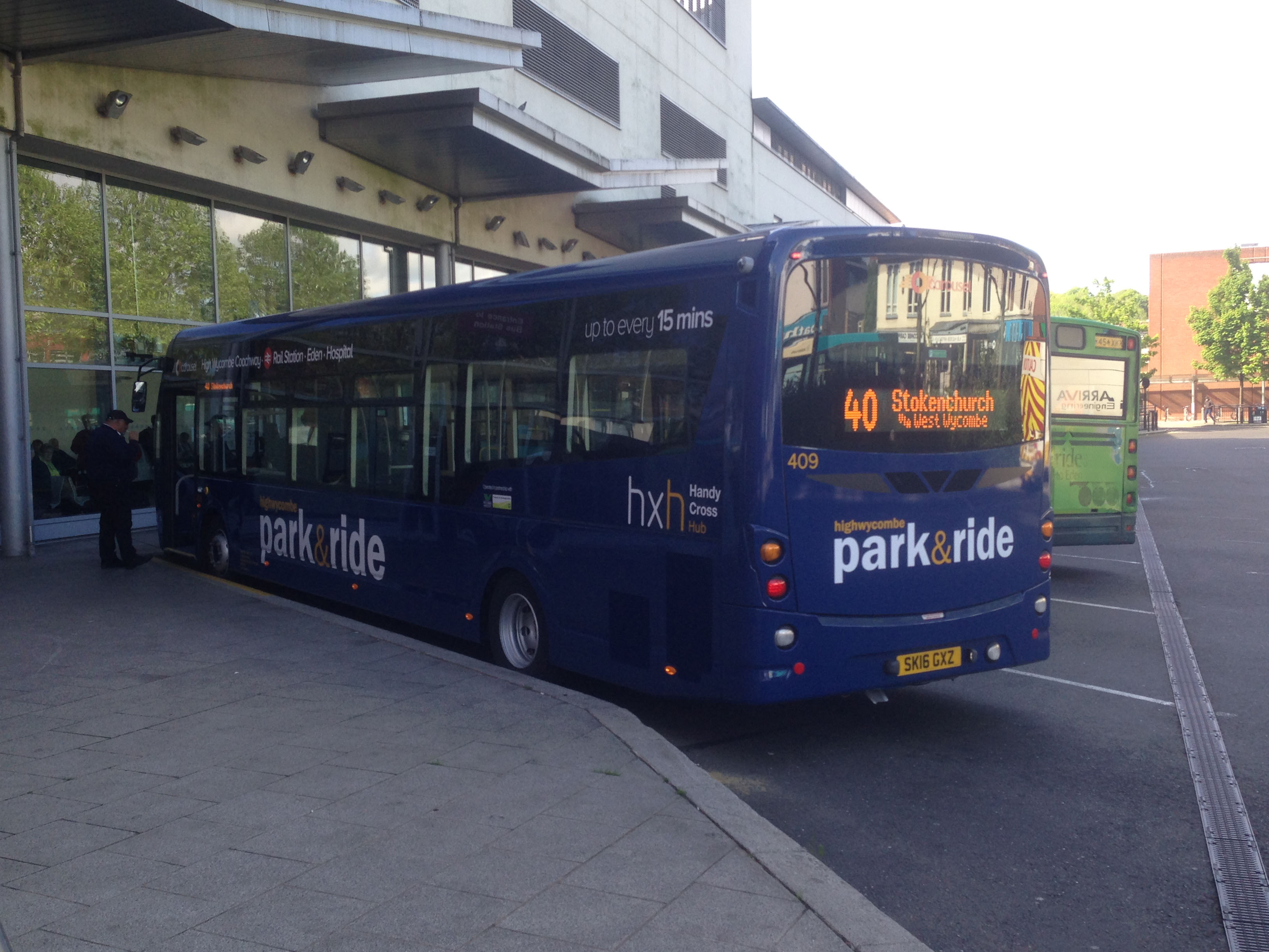 A new venue for the Park & Ride site was opened in early 2016, adjacent to the Coachway at Handy Cross and the M40. The P&R contract passed from Arriva the Shires to Carousel and new Wright Streetlite DF buses in a special blue livery were assign to the service. This is 409 (SK16GXZ) being used on the 40 service to Stokenchurch despite its route branding!